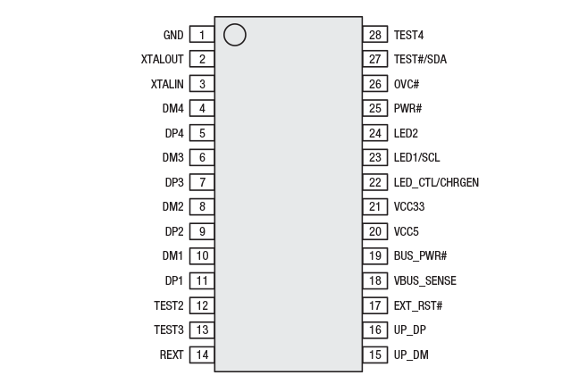 The upstream USB interface has an integrated USB 2.0 PHY and device controller that is compliant with both hi-speed (480Mbps) and full-speed (12Mbps) and downstream PHY supporting hi-speed, full-speed and low-speed (1.5 Mbps) on each of the 4 downstream ports.