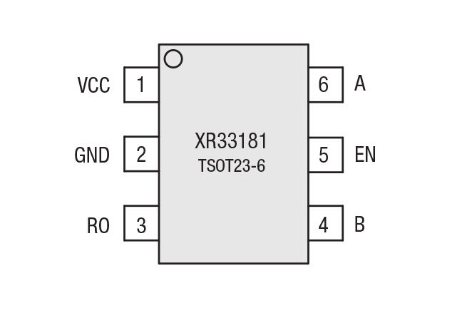 The XR3318x offers several pinout options to maximize performance in different applications while maintaining a minimum pin count. The XR33180 is available in a 5-pin TSOT23 package with the receiver always enabled. The XR33181 is available in a 6-pin TSOT23 package and offers an active high receiver enable pin while the XR33183 has the same pinout but with active low enable pin. The XR33184 is available in a 6-pin TSOT23 package with an I/O logic supply pin to ease the interface to MCU’s or FPGA’s that run off of different supply voltages. The VL supply pin allows the XR33184 to interface to other devices running off of supplies from ranging from 1.65V to VCC.